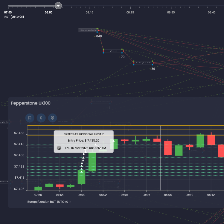 Replay strategy execution timeline at the event level to analyse the state of each rule and trade at any point.